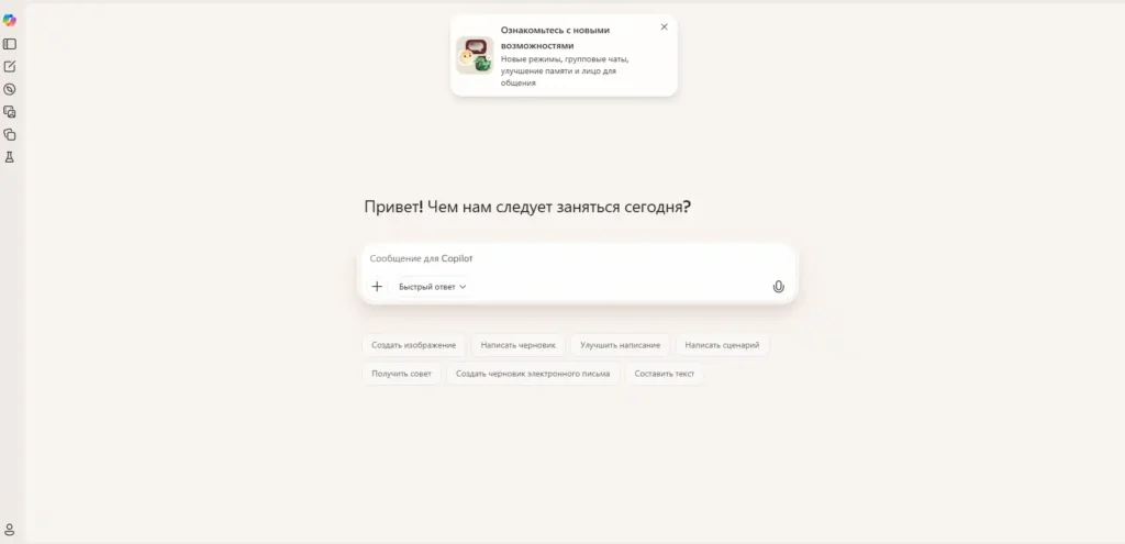 Скриншот главного экрана Bing Copilot — интеллектуального ассистента от Microsoft на базе GPT-4 Turbo для поиска и генерации контента.