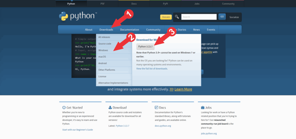 Python-ды жүктеу үшін ресми python.org сайтына өтіңіз. Жоғарғы мәзірден Downloads бөліміне кіріп, өз операциялық жүйеңізді таңдаңыз (мысалы, Windows). Содан кейін Python-ның соңғы тұрақты нұсқасын жүктеу батырмасы пайда болады, мысалы, Python 3.13.7.