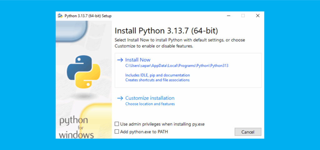 Install Now — көпшілік пайдаланушыларға ұсынылатын әдіс. Бұл жағдайда Python әдепкі баптаулармен автоматты түрде орнатылады: IDLE редакторы, pip пакет менеджері, құжаттама қосылады және барлық қажетті ярлыктар жасалады. Бұл нұсқа Python-мен тез жұмыс бастағысы келетіндерге ыңғайлы.