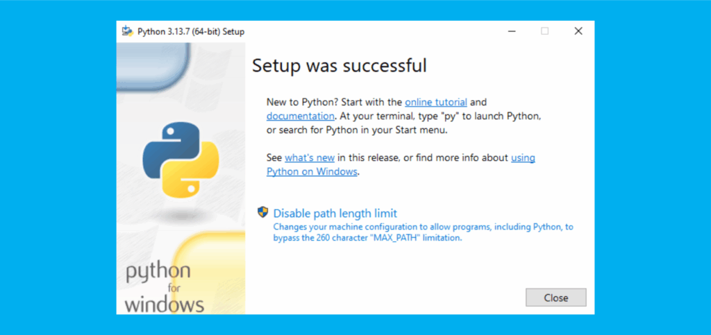 Python-ды Windows жүйесіне орнату аяқталғаннан кейін экранда “Setup was successful” (Орнату сәтті аяқталды) деген терезе пайда болады. Бұл терезе дұрыс орнатылғанын растайтын алғашқы белгі болып табылады және бастапқыда пайдалы кеңестер ұсынады. Оны кезең-кезеңімен қарастырайық: