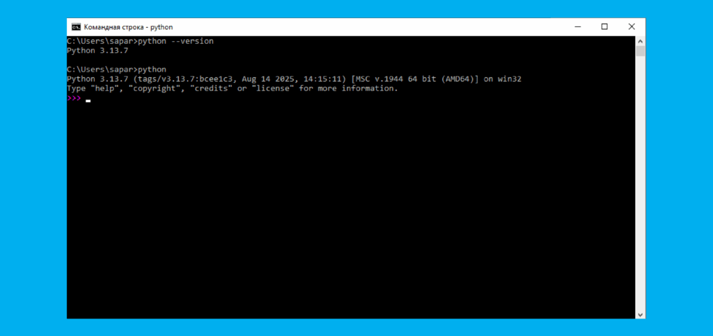Python интерактивтік режимі ашылып, “>>>” шақыруын көрсетуі керек. Шығу үшін exit() деп теріңіз немесе Ctrl+Z және Enter пернелерін басыңыз.